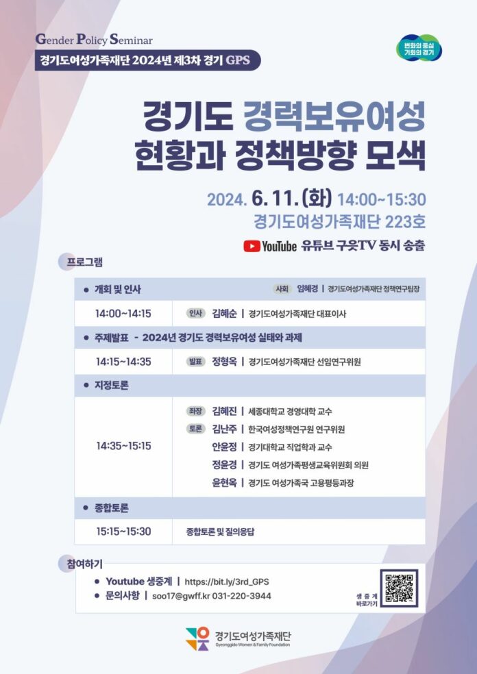 경기도여성가족재단 공식 유튜브 채널(구읏TV)로 생중계되는 이날 포럼에서는 재단이 경기도 거주 20~64세 여성 2천 명을 대상으로 실시한 ‘2024년 경기도 경력보유여성등의 경제활동 실태조사’ 결과를 발표한다. 이를 토대로 향후 경기도 경력보유여성들의 경제활동 지원 방향에 대해 전문가, 도의원, 공무원 등과 함께 논의한다.
