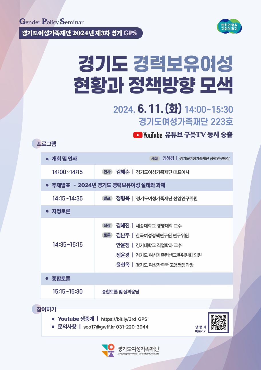 경기도여성가족재단이 경기도 경력보유여성등의 경제활동 현황을 토대로 향후 정책 방향을 논의하기 위해 11일 재단 회의실에서 제3차 경기GPS(Gender Policy Seminar)를 개최한다.