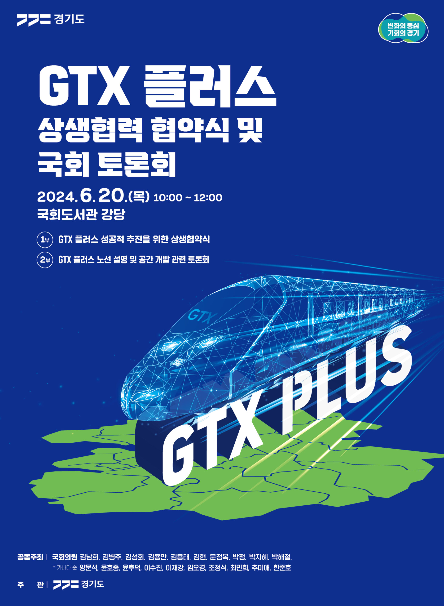 경기도는 오는 20일 오전 10시 국회도서관 강당에서 김동연 경기도지사와 국회의원을 비롯한 고양, 남양주, 안산, 시흥, 파주, 의정부, 하남, 광명, 구리, 포천 등 10개 자치단체장이 참석하는 ‘GTX 플러스 상생협력 협약식 및 국회토론회’를 연다고 16일 밝혔다. 이번 행사는 경기도 지역구 국회의원 20명이 공동 주최자로 동참해 국회 차원의 국민적 관심과 공감대를 형성하는 기회가 될 것으로 기대된다.