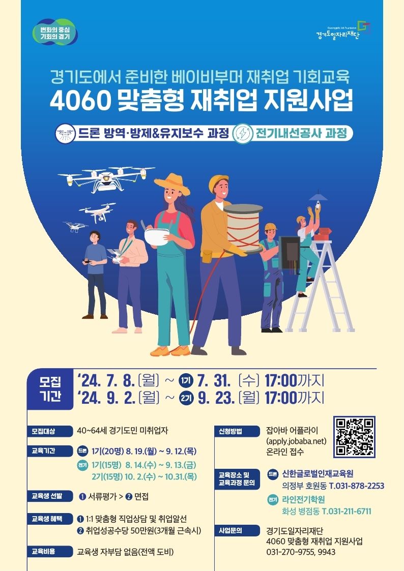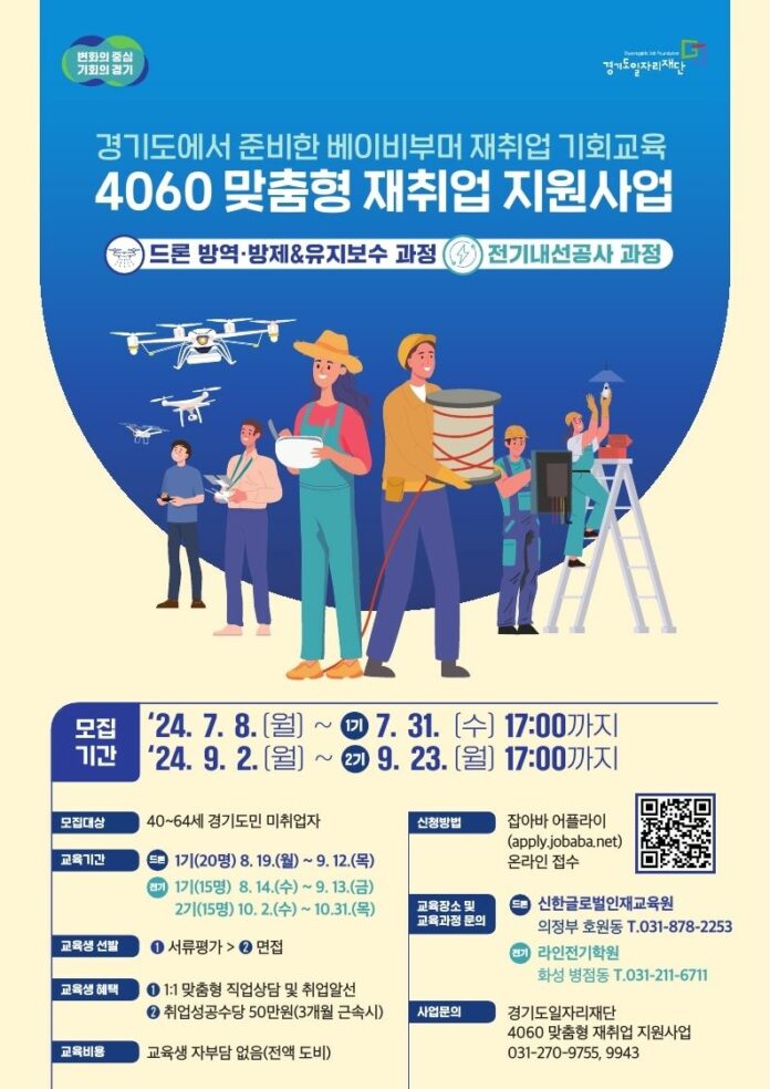 경기도일자리재단(이하 재단)과 경기도는 베이비부머 재취업 기회를 위해 7월 8일부터 31일까지 ‘2024년 4060 맞춤형 재취업 지원사업’ 교육에 참여할 2차 훈련생 1기를 모집한다.