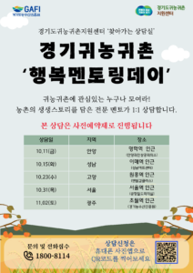 경기도와 경기도농수산진흥원이 운영하는 경기도귀농귀촌지원센터에서 10월 11일부터 찾아가는 상담실 ‘행복멘토링 데이’를 운영한다.