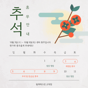 센터는 오는 10월 3일(수)부터 10월 9일(목)까지 추석 및 한글날 연휴로 휴무에 들어가며, 연휴 전후인 10월 2일(수)과 10월 10일(금)부터는 정상 운영한다.